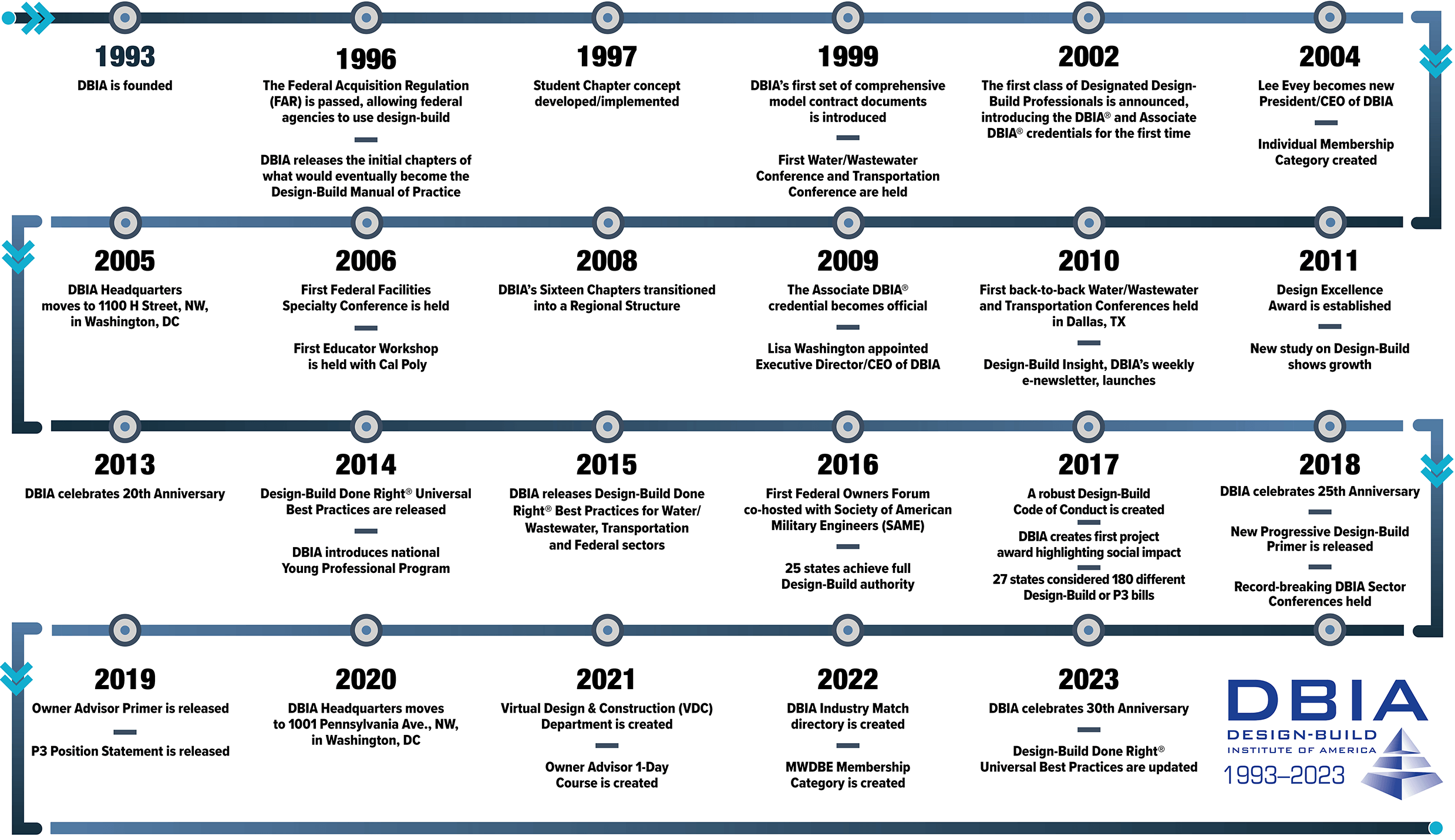[button text=”Download PDF” url=”https://dbia.org/wp-content/uploads/2023/04/DBIA-30th-Anniversary-Milestones-Timeline.pdf”]