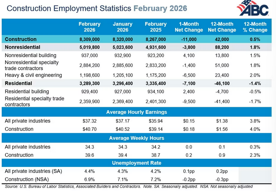 Construction employment has declined in eight of the past 11 months. This, in combination with a decrease in construction spending, could forecast a downbeat outlook, according to ABC economists.