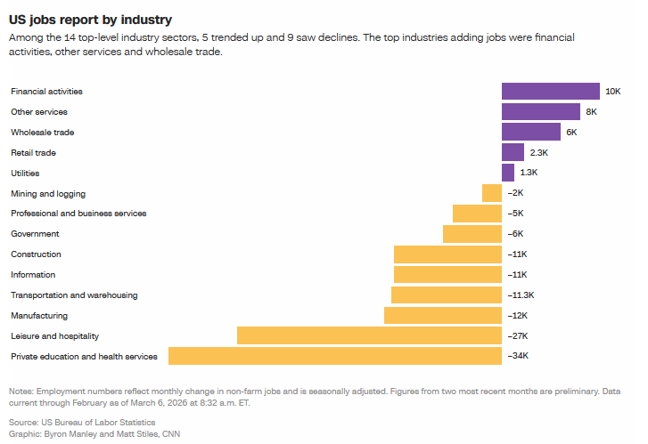 Revisions also softened the previous two months’ numbers. January jobs numbers were revised down slightly from 130,000 to 126,000, while December’s were reduced more sharply from 48,000 to 17,000. With February’s losses included, the latest report marks the third time in the past five months that payrolls declined.