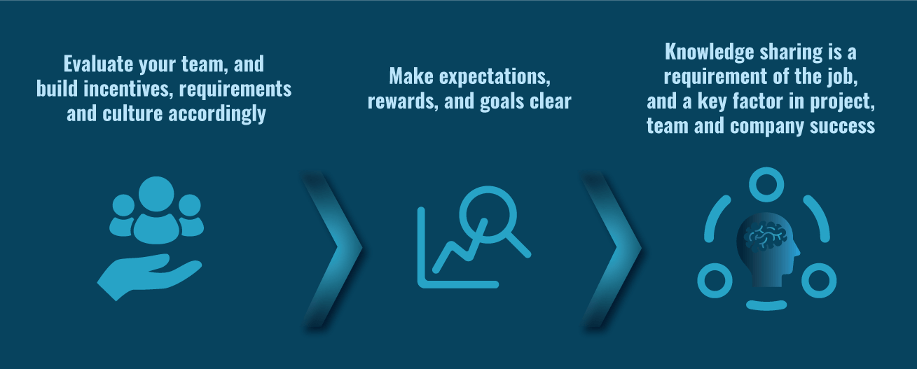 - Think of knowledge sharing as a mission critical workflow: Evaluate your team and build incentives, requirements and culture accordingly. Make expectations, goals and rewards clear. Knowledge sharing is a requirement of the job and a key factor in project, team and company success.