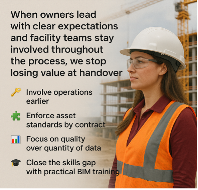 Don’t wait for handover to start talking about data. Decide what’s needed at the 30% design mark: asset types, formats, naming standards and maintenance fields. - Verify as you go
