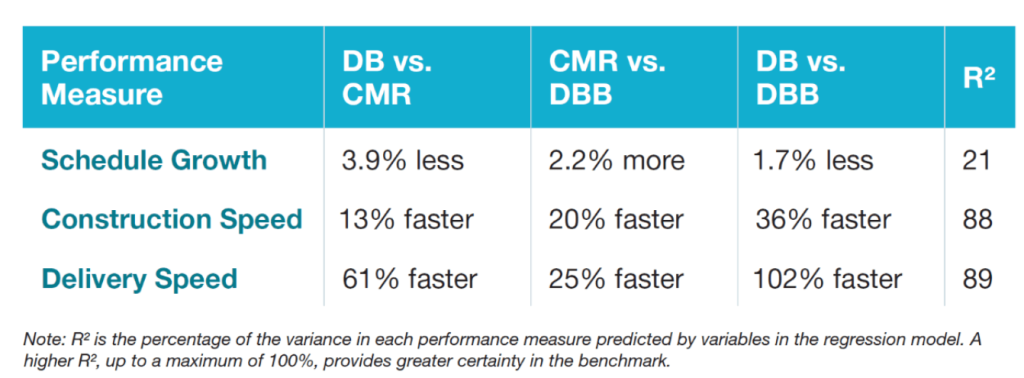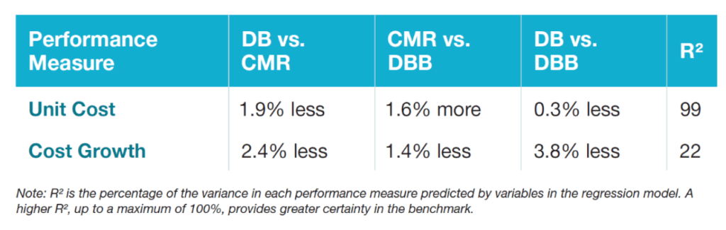 Project Cost: On average, projects using Design-Build (DB) cost 1.9% less per square foot when compared to Construction Manager at Risk (CMR) and 0.3% less when compared to Design-Bid-Build (DBB). Design-Build projects also average 2.4% less cost growth than a comparably scoped project using CMR and 3.8% less cost growth than a project using DBB.