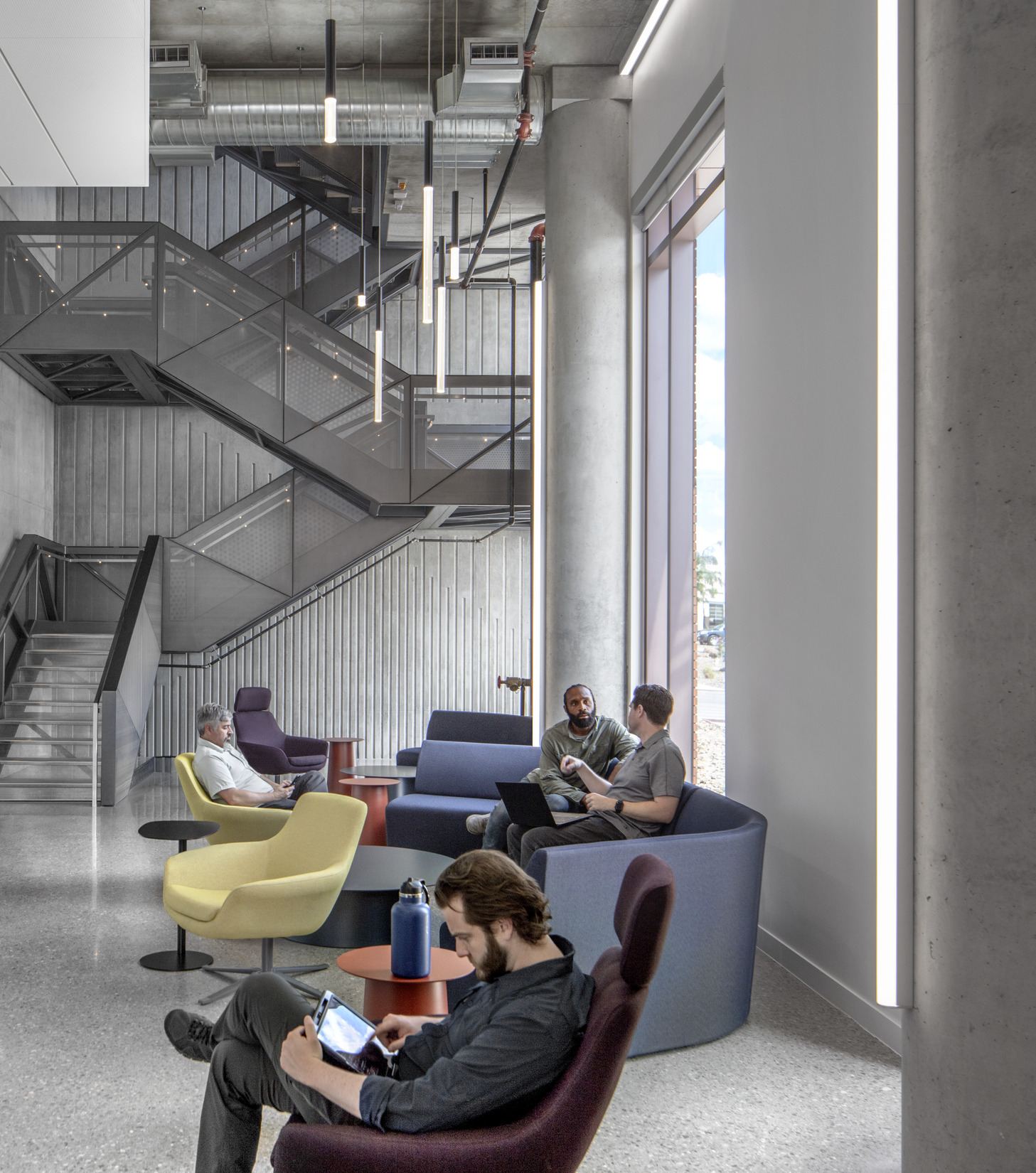 The building’s façade design stands out, ingeniously responding to its environment with sustainable features like textured vertical fins, integrated frit and a breathable rain screen to reduce solar heat gain, balancing energy efficiency with occupant comfort. Its crinkled metal exterior mimics the solar arrays of space stations, reflecting the university’s mission. Sustainability is key, from energy-efficient systems to conservation efforts that include recapturing water on site, storing below grade, and filtering through bio-swales and rain gardens. Awards jurors praised how the project “enhances the experience of occupants through daylit collaboration spaces and visual interdepartmental connectivity.”