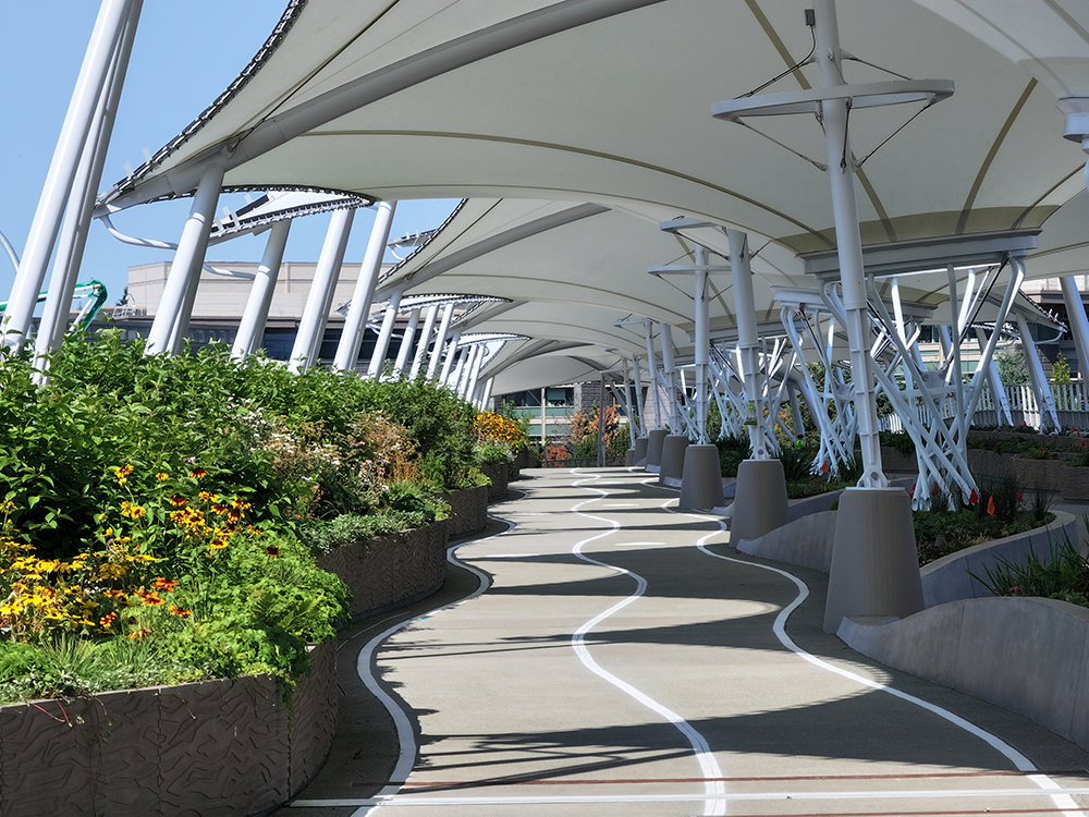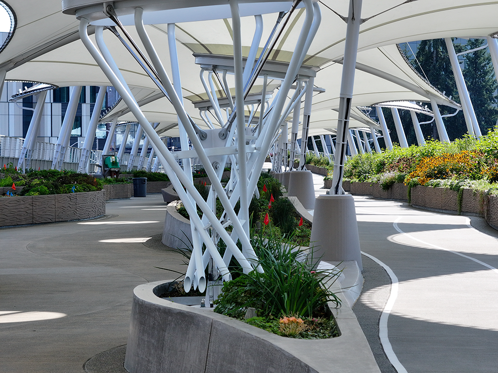 Designed to blend with its surroundings, the bridge draws inspiration from nearby mountain ranges. A white tensile fabric canopy supported by alternating steel members provides weather protection while integrating with a rain garden system for stormwater management. Safety and accessibility features include separate pedestrian and bike paths, tactile paving and under-canopy lighting. Planter beds and landscaping with native vegetation create an inviting park-like feel, transforming the bridge into a beautiful public space that encourages uses beyond commuting. Additionally, its low-maintenance materials reduce long-term operational costs for the City of Redmond.