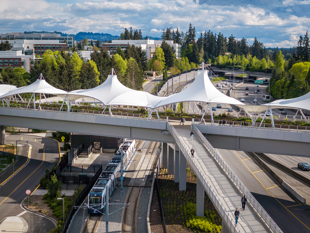 The project’s success stemmed from a highly collaborative design-build approach involving Microsoft, Sound Transit, the City of Redmond and WSDOT. Early integration of design and construction enabled faster decision-making, efficient problem-solving and alignment of the project’s functional, aesthetic and sustainability goals. Real-time coordination meetings helped stakeholders address challenges such as the COVID-19 pandemic, a regional concrete supply strike and a carpenter strike — delivering the project on time and on budget despite these disruptions.