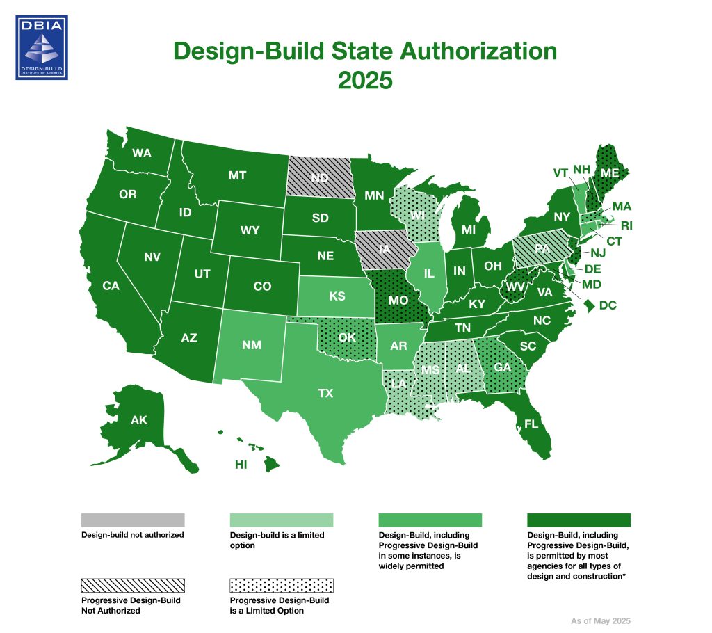 - 2025 State Statute Report: A guide to state design-build laws providing Owners, lawmakers and industry professionals with the statutory information needed to guide their project delivery decision making.